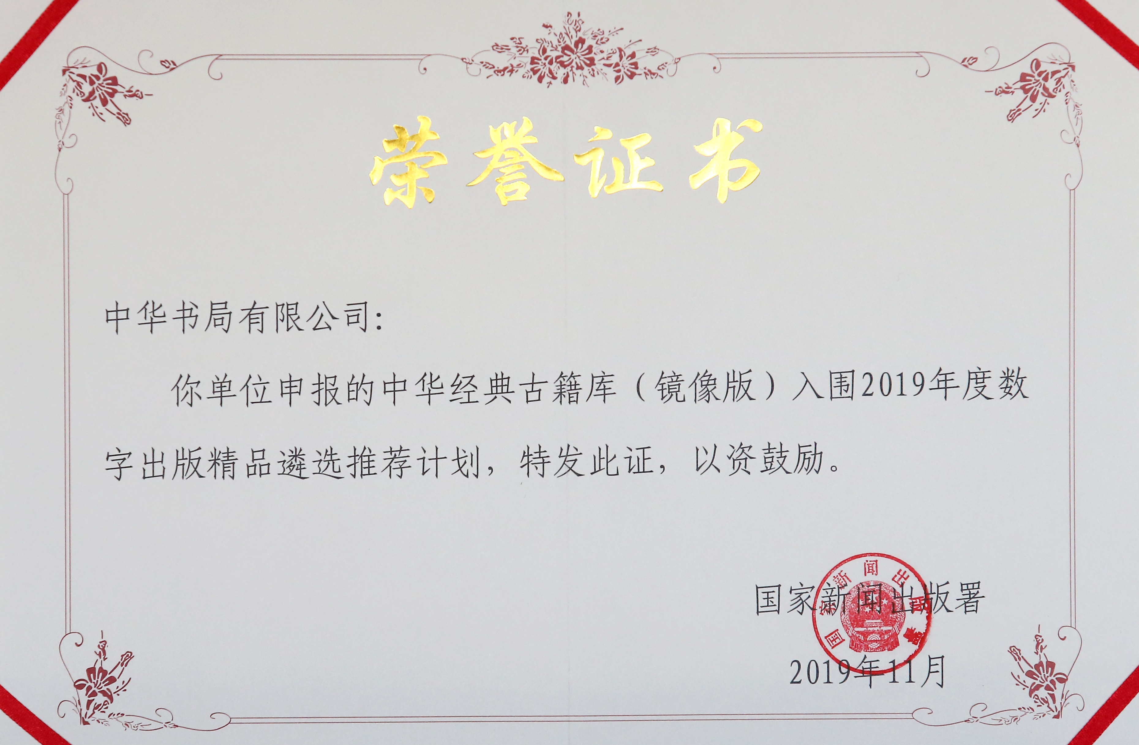 《中華經(jīng)典古籍庫》(鏡像版)入選新聞出版總署“2019年度數(shù)字出版精品遴選推薦計劃”