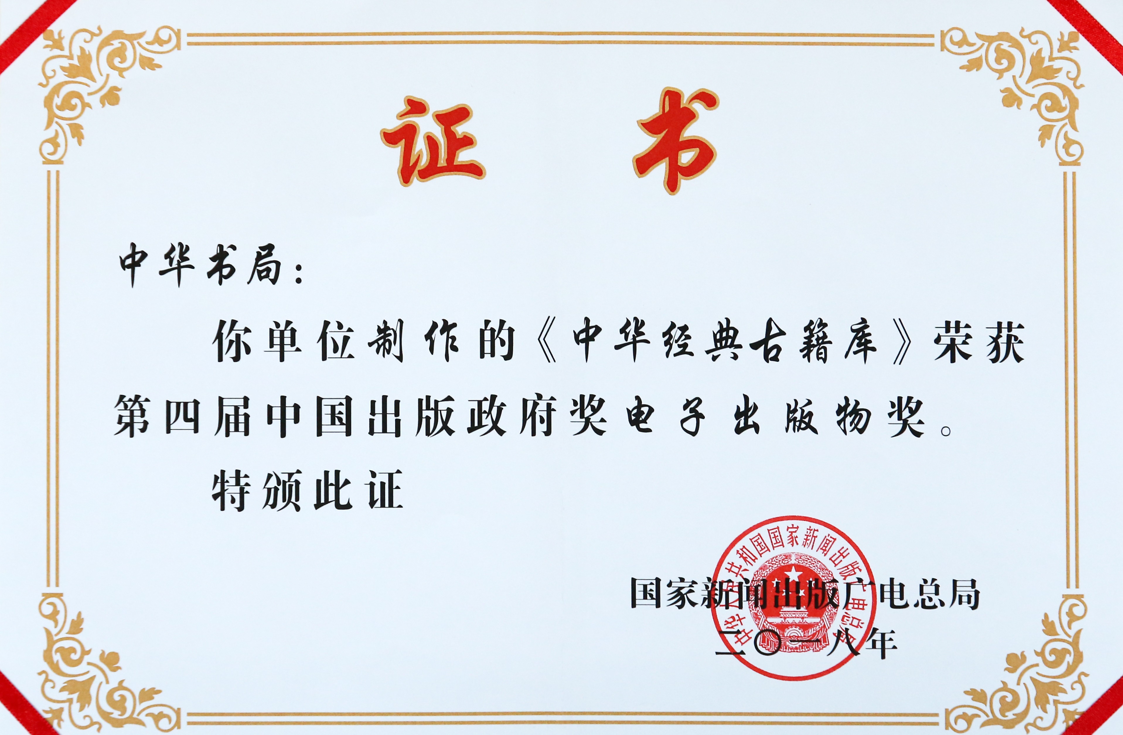 《中華經(jīng)典古籍庫》(鏡像版)榮獲中國出版協(xié)會“第四屆中國出版政府獎電子出版物獎”